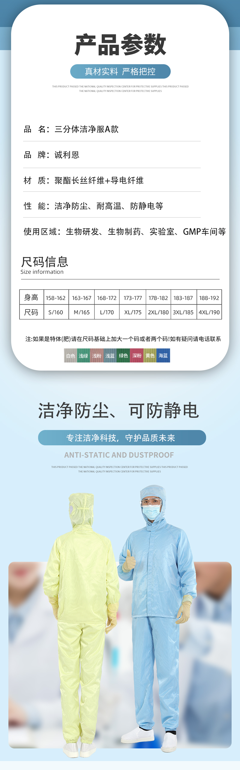 產品性能優勢:潔凈防塵、阻隔粉塵顆粒物、耐高壓濕熱滅菌、永久防靜電、立體剪裁、不起球、布面光潔