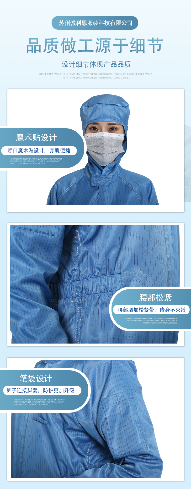 產品性能優勢:潔凈防塵、阻隔粉塵顆粒物、耐高壓濕熱滅菌、永久防靜電、立體剪裁、不起球、布面光潔