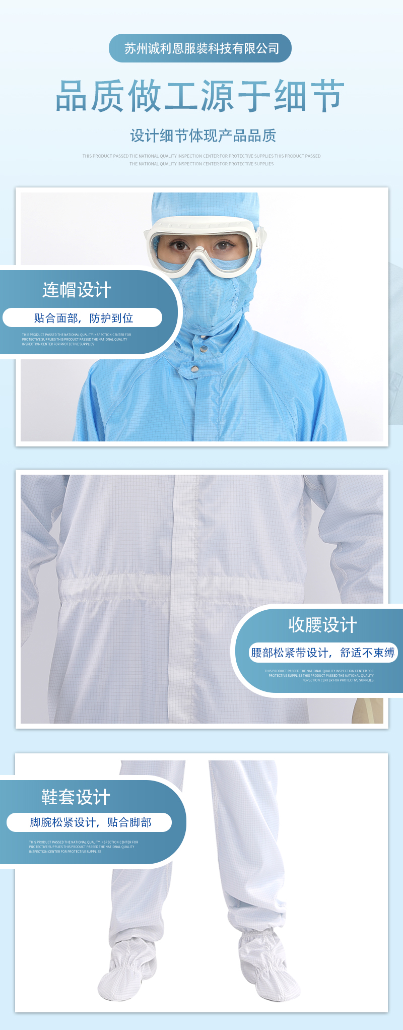 產品性能優勢:潔凈防塵、阻隔粉塵顆粒物、耐高壓濕熱滅菌、永久防靜電、立體剪裁、不起球、布面光潔