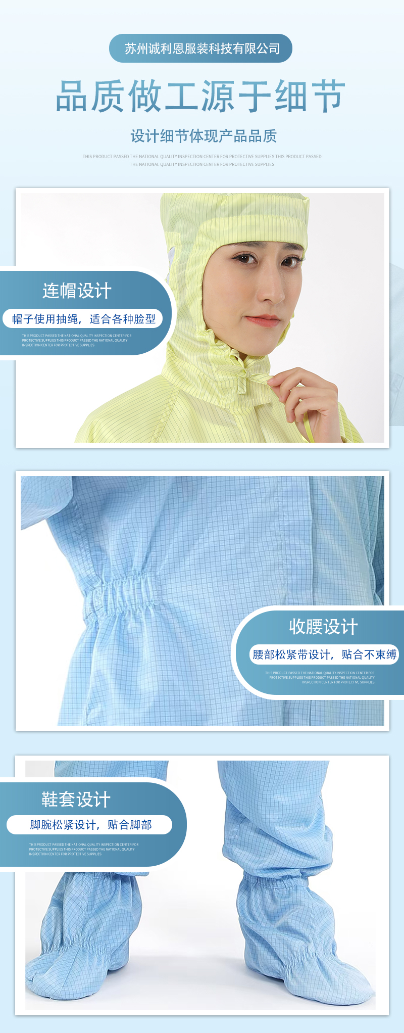 款式說(shuō)明:四連體,上衣連帽子褲子連腳;領(lǐng)口抽繩魔術(shù)貼設(shè)計(jì),更貼合面部,使防護(hù)更嚴(yán)實(shí)。腰部松緊帶設(shè)計(jì),彎腰不束縛、穿著更為舒適